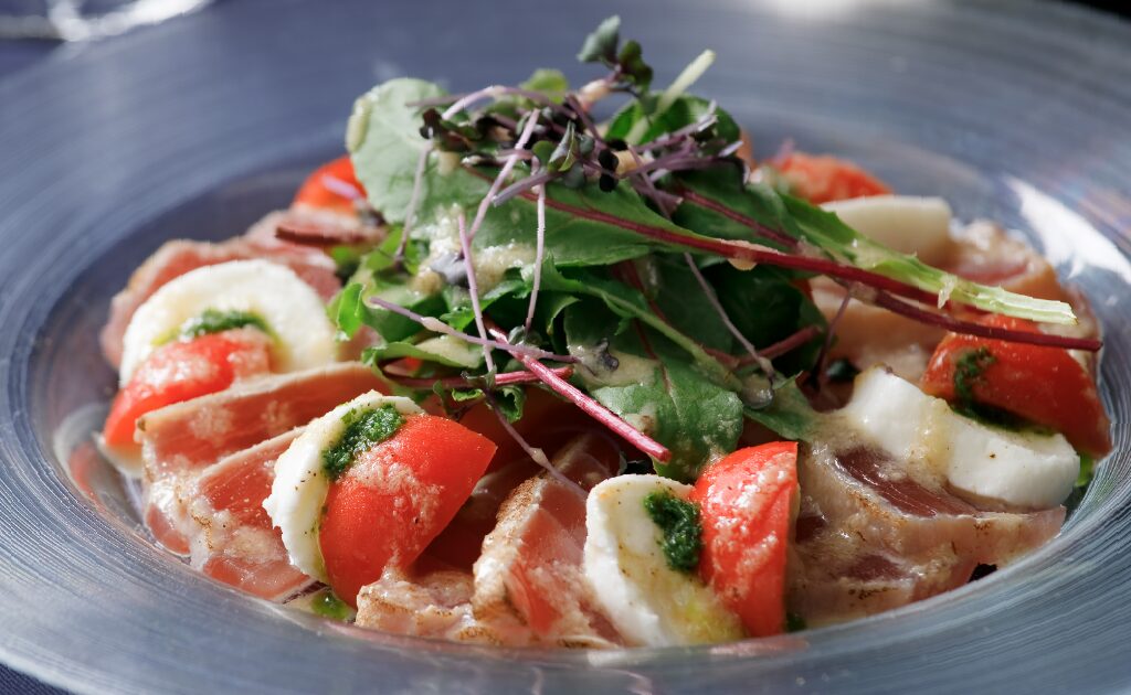 - 炙りマグロのカルパッチョ、水牛モッツァレラチーズとトマトのカプリ風