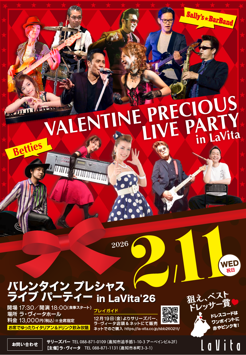 「本ページ予約フォーム」「ラ・ヴィータ1Fホールフロント」「サリーズバー(8:00pm~)」にて開始!